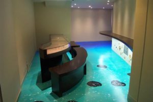 動物をモチーフにした、作家の手によるジュエリーを主に揃えたショールームです。地層を思わせる左官仕上の壁面と海面のきらめきを表した床のグラフィックが来訪者をゆったりと包み込みます。 正面の壁はプロジェクターで…