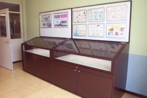 工場で製造する鍛鋼製バルブ ・鍛造製品の展示用ショーケースです。製品の重量に耐えうる堅牢な作りと、展示製品を組み替える際の作業性を考慮したガススプリング式のハッチが特徴です。バックパネルにはホワイトボードと…